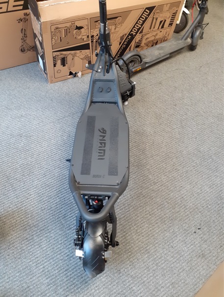 Uueväärse välimusega ja väga väikese läbisõiduga 28Ah / 72V akuga Nami Burn-E 2 Viper elektriline tõukeratas. Elektritõukerattal on seisuplatvormi äärel vähe nähtavas kohas värvidefekt.