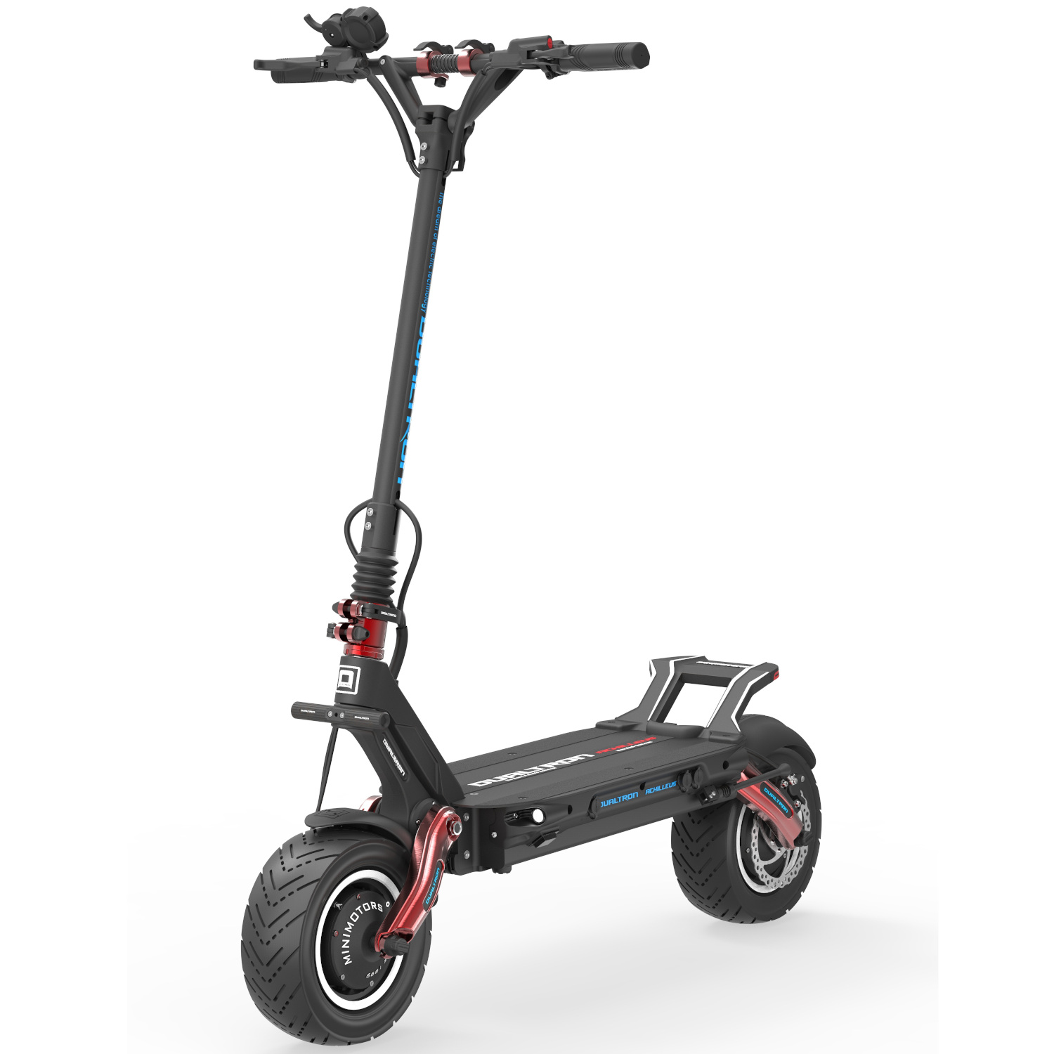 Erittäin leveät, 11-tuumaiset letkuttomat renkaat, jotka on varustettu myös puhkeamisen kestävällä tekniikalla, tekevät ajamisesta turvallisempaa. Renkaan sisäpuolelle liimattu elastinen puhkeamisen kestävä kerros sulkee puhkeaman ja estää ilman pääsyn ulos, vaikka rengas puhkeaisi kokonaan. Kuten kaikissa Minimotors Dualtron -sähköpotkulautoissa, Dualtron Achilleus -sähköpotkulauta on varustettu jousituspuomissa alemmalla iskunvaimentimella, joka vähentää ajamisen aikana esiintyvää tärinää, sekä kokoontaitettavalla jousituspuomilla.