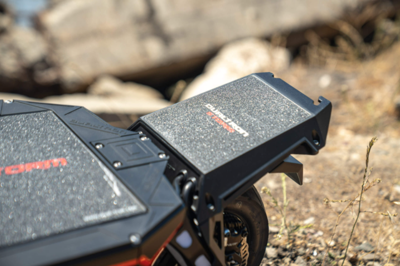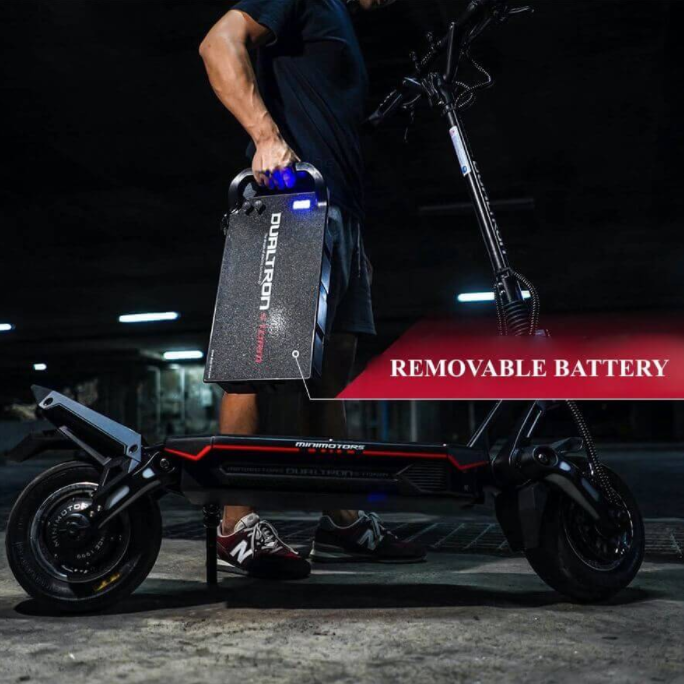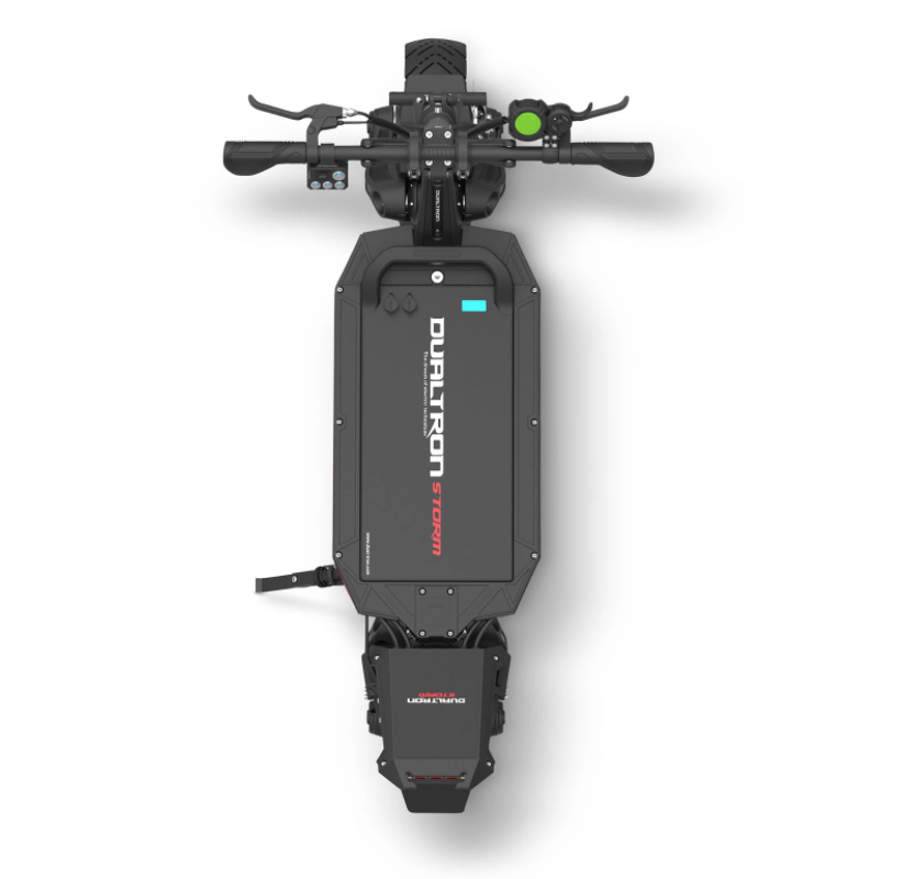Dualtron Storm on Minimotorsin Dualtron-sarjan sähköskoottereiden uusi sukupolvi. Se on myös maailman suurin sähköskootteri, jossa on irrotettava akku. Suuri 72V/31,5Ah/2268Wh akkupaketti painaa 14kg ja sillä voi ajaa jopa 130km yhdellä latauksella. Tämä akkupaketti mahtuu onnistuneesti myös reppuun, joten tällä sähköpotkulautalla voi ajaa esimerkiksi Tallinnasta Tarttoon kahdella akulla. Tämä on vaihtoehto, jota muut markkinoilla olevat sähköskootterit eivät voi tarjota. Akku on myös lukittavissa avaimella varkaussuojan lisäämiseksi.