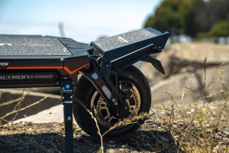 Moottoreissa on myös vaihdettavat vanteet. Tämä mahdollistaa sen, että käyttäjä voi hankkia esimerkiksi maastorenkaat, joissa on lisävanteet, ja vaihtaminen näiden kahden rengastyypin välillä on erittäin nopeaa ja helppoa eikä vaadi renkaiden vaihtoa. Dualtron Storm -sähköskootteri, kuten kaikki Minimotors Dualtron -sähköskootterit, on varustettu Minimotors EY3 -näytönohjaimella, jossa on paras kaasutuntuma ja kaasun vasteaika. Näytön teksti on luettavissa myös auringonpaisteessa vihreän taustavalon ja mustien kirjainten ansiosta. Edellisen sukupolven tapaan Storm-sähköskootteri on varustettu kumisilla puskurikiinnikkeillä. Valittavana on 5 eri jäykkyydeltään erilaista holkki ” kasettia” . Vaikka tämä jousitettu jousitus on hieman huonompi kuin jousikiinnikkeet, se takaa ennen kaikkea sähköpotkulaitteen parhaan mahdollisen vakauden ja ohjattavuuden suurissa nopeuksissa. Lisäksi suuret 11 tuuman leveät 90/65-6,5 -putkettomat renkaat varmistavat osaltaan mukavuutta.