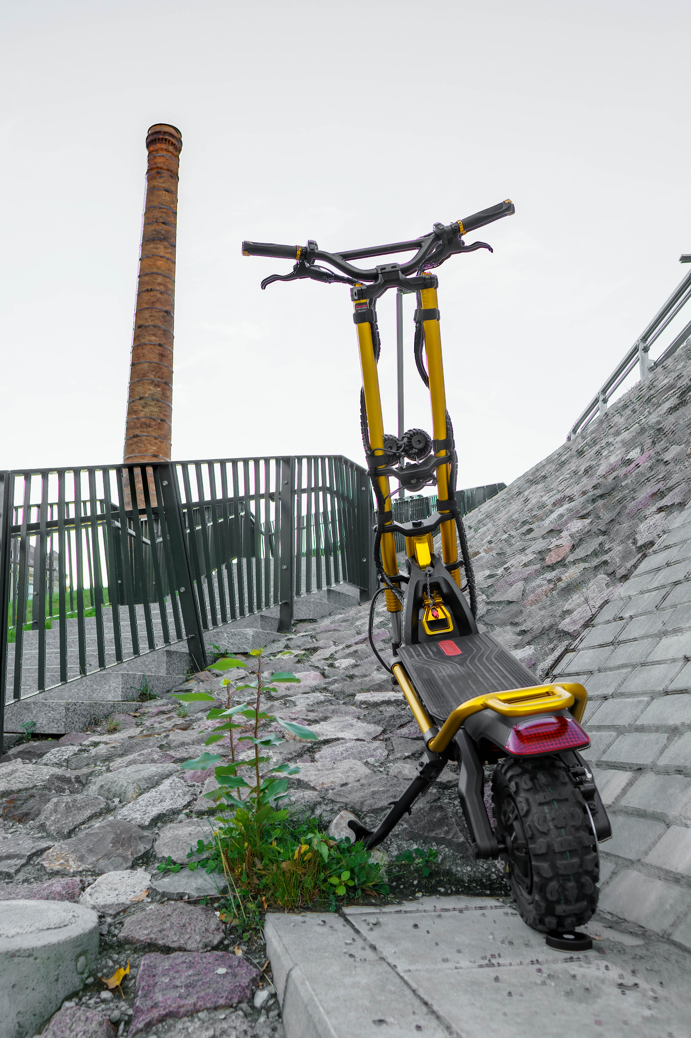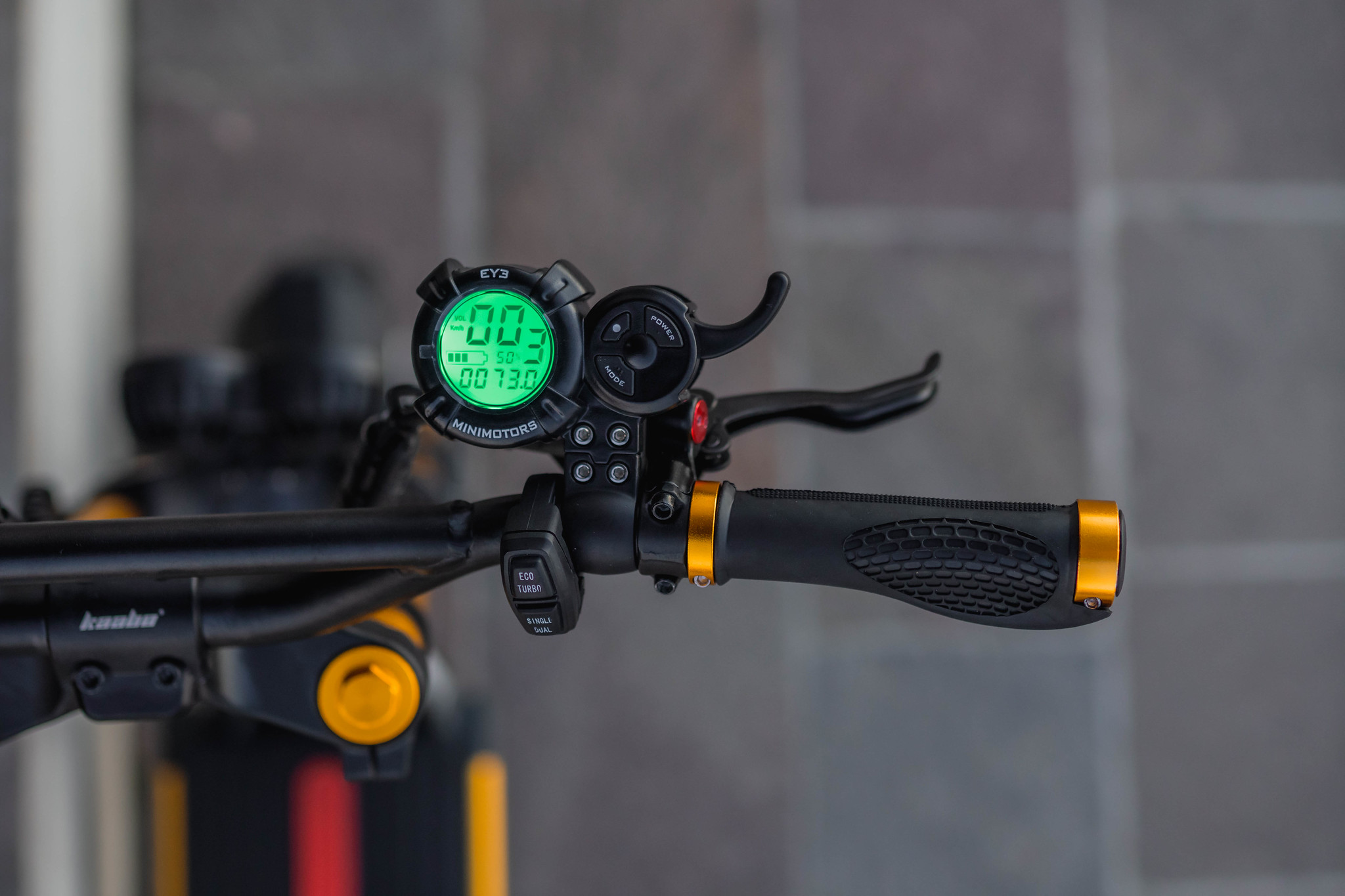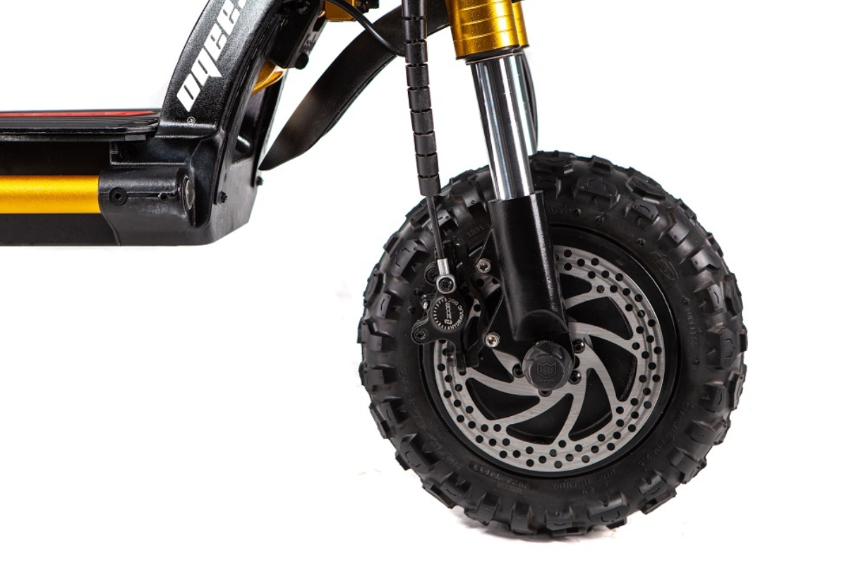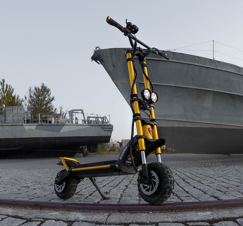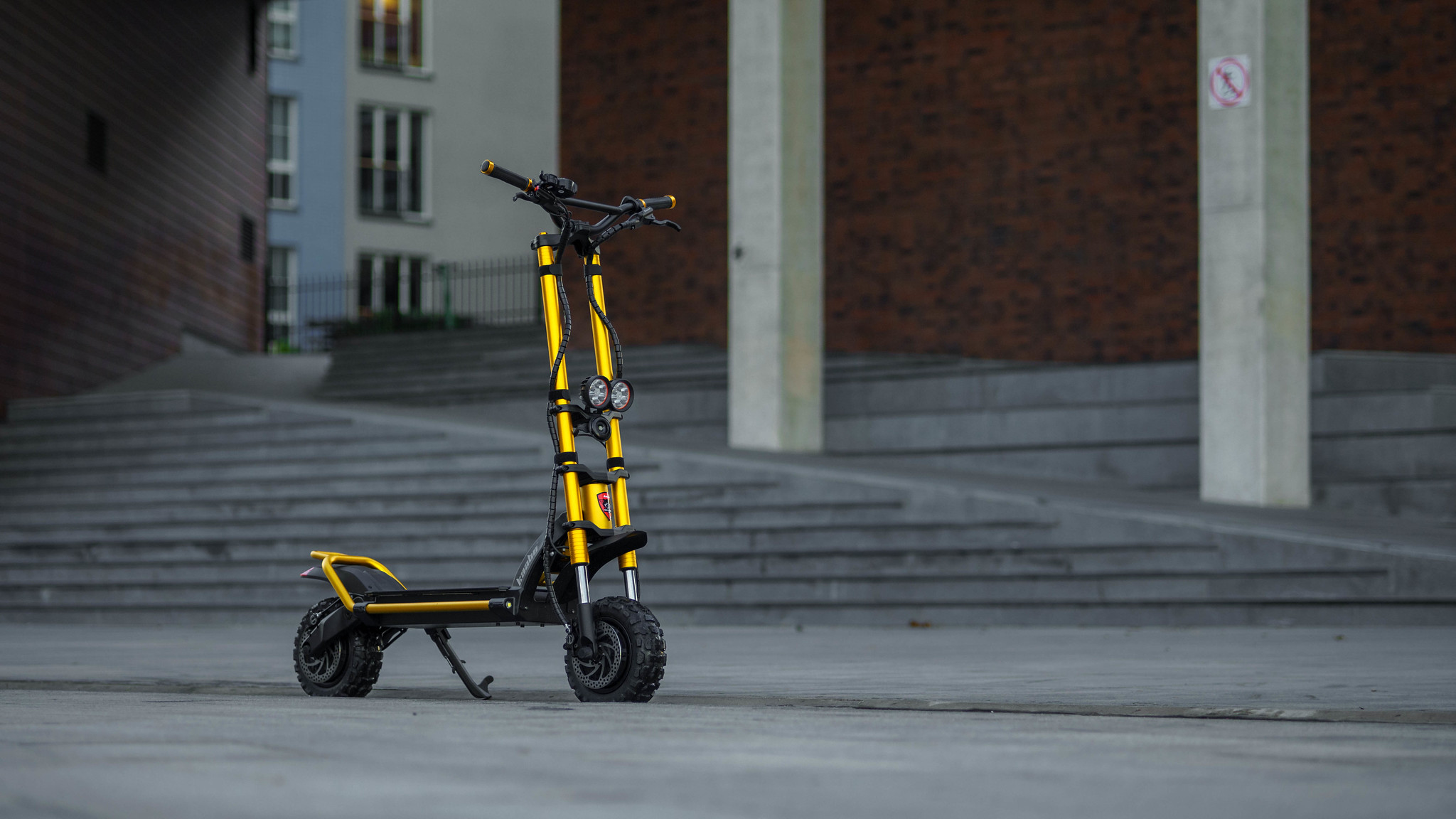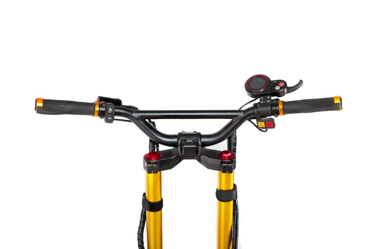 Kun katsot sähköpotkulautaa ensimmäisen kerran, silmiinpistävä on jättikokoinen etummainen hydraulinen iskunvaimennin, joka tarjoaa parhaan mahdollisen ratkaisun ajamiseen vaikeassa maastossa ja vakauden ylläpitämiseen suurilla nopeuksilla. Takapyörässä on perinteisemmät mutta erittäin luotettavat jousituskiinnikkeet. Sähköskootterin runko on valmistettu erittäin kestävästä 6082-alumiiniseoksesta, jota käytetään siltojen ja nostureiden rakentamisessa, ja sähköskootterissa on myös leveä ohjaustanko / ohjaustanko, jossa on erittäin ohuet, maastopyörää muistuttavat kahvat.