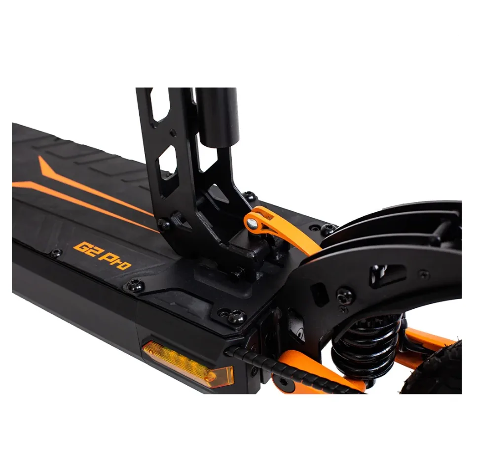G2 Pro -sähköskootterissa on korkea ohjaustanko, joka tekee ajamisesta mukavaa ja miellyttävää pidemmille kuljettajille. 9″ paksut pneumaattiset renkaat auttavat vaimentamaan tieltä sähköskootteriin siirtyvää tärinää. Etu- ja takaosan kumiholkkityyppiset iskunvaimentimet auttavat pehmentämään kyytiä isompia kuoppia vastaan. Kugoo G2 Pro -sähköskootteri on saatavana 48V/15Ah/720Wh Li-Ion-akulla. Täydellä akulla G2 Pro voi ajaa jopa 55km. Kuten minkä tahansa sähköskootterin kohdalla, realistinen matka täysin ladatulla akulla ja nopealla vauhdilla on G2 Pro:lla todennäköisesti 40-48 km.