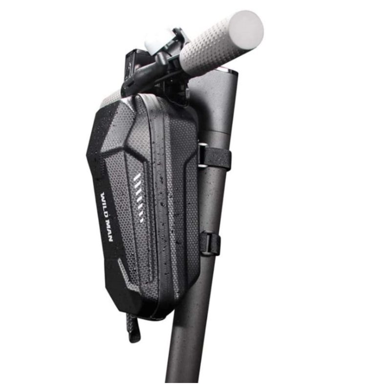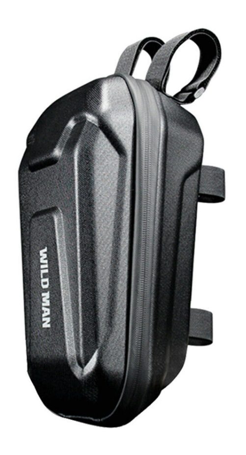 Ohjauslaukku sähköskootterille (myös etupyörälaukku), vedenpitävä / sateenpitävä , musta väri, Wild Man -merkki, tilavuus 3 litraa. Sähköskootterin ohjaustankolaukku kiinnittyy skootterin ohjaustangon ja ohjausputken (ohjausputken) ympärille säädettävillä klipseillä (hihnoilla), ja se sopii kaikkiin sähköskoottereihin. Wild Man -sähköskootterilaukkujaon saatavana myös hieman pienempinä 2 litran tilavuudella.