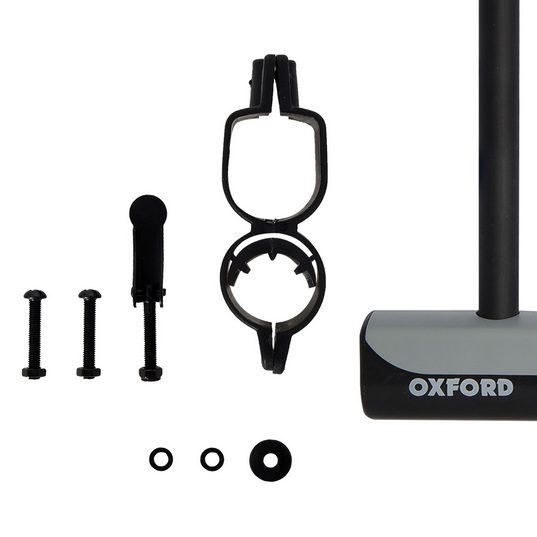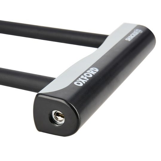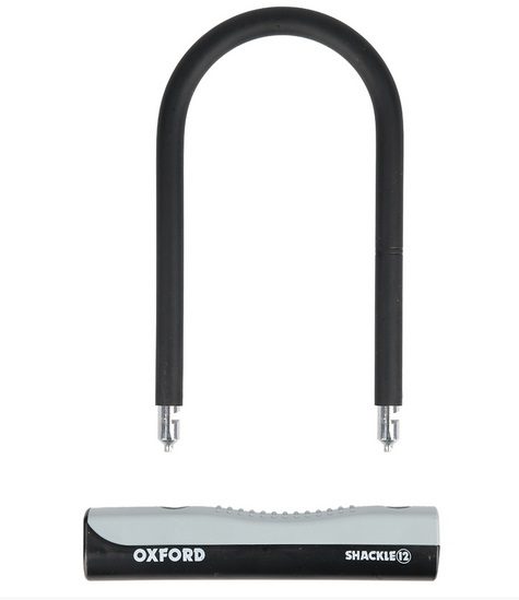 Sähköpolkupyörän U-lukko Oxford Shackle 12. Lukon mitat ovat 245mm x 190mm. Kiinnikkeen ansiosta lukko on erittäin kätevä kiinnittää polkupyörän ja joidenkin sähköpotkulautojen runkoon. U-lukko on valmistettu joustamattomasta materiaalista, ja siinä on vahva terässeoksen sisäpuoli, joka on päällystetty kumikerroksella, joka estää lukkoa vahingoittamasta maalia, kun se on kosketuksissa lukittavan polkupyörän tai sähköskootterin runkoon. U-muotoinen lukko on edullisin vaihtoehto erittäin turvalliselle lukolle, jonka voi katkaista vain ketjuleikkurilla (relakas). Hieman kalliimpi vaihtoehto on kytkinlukko. Sen mukana toimitetaan 2 avainta.